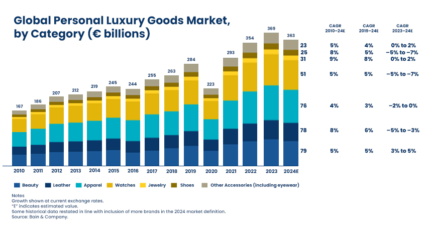 According to Bain & Company, global luxury spending will stabilise around EUR 1.44 trillion in 2025, essentially flat compared with the previous year. The personal luxury goods segment, once luxury’s beating heart, is forecast to shrink by nearly 2%. Apparel and leather goods, the traditional growth engines, are past their peak. Only select categories, such as jewellery, fragrances, and eyewear, remain resilient.