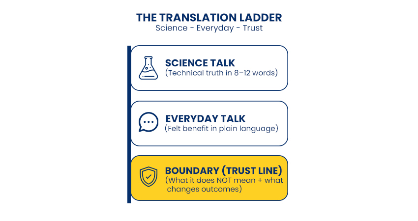 In laboratory settings, truth is conditional and such nuance is standard; statements specify conditions, timelines, test contexts, and acknowledge variability. In contrast, consumers interpret claims as definitive verdicts, reflecting the nature of commercial language. This disconnect often traps founders, who adopt scientific terminology to appear credible but fail to translate boundaries into accessible, relatable language.