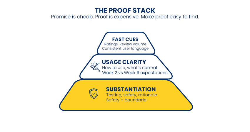 Many emerging brands view “proof” as a singular asset, such as a badge, before-and-after photo, or clinical phrase on packaging. However, customers see evidence of the brand’s commitment in every interaction. Trust erodes rapidly when customers must work to understand claims, as this can create a perception of concealment.