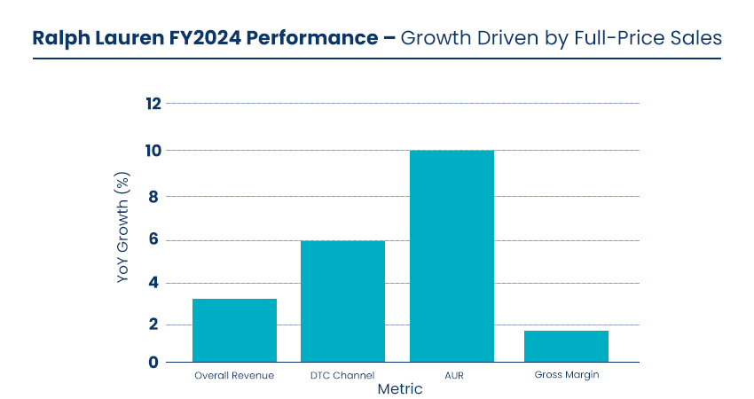 Ralph Lauren is a clear example. In fiscal year 2024, the brand’s direct-to-consumer (DTC) channel grew 6%, driven by full-price sales and an 11% rise in average unit retail (AUR). Meanwhile, overall revenue increased 3%, and the company reported gross margin gains from reduced discounting and stronger pricing discipline. The message is simple: when your MRP holds meaning on your own surfaces, the code stops being the hook. Advertising then amplifies a healthy engine instead of keeping it alive.