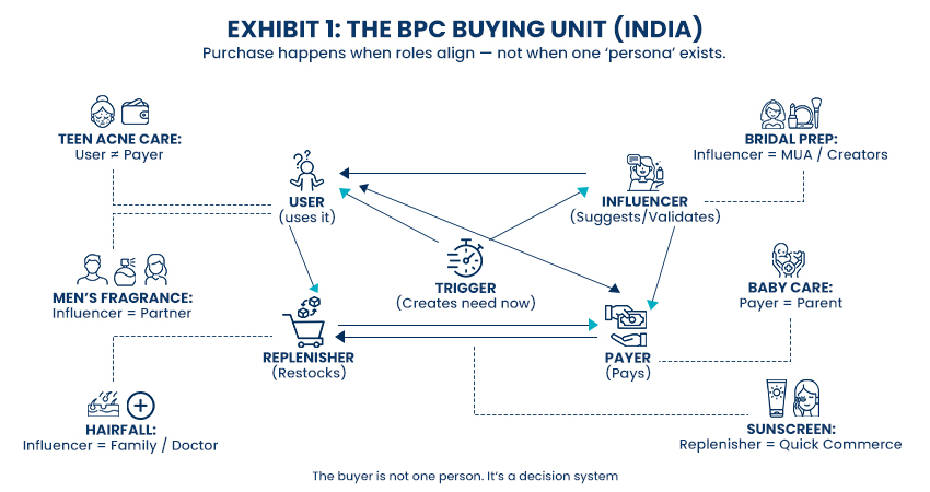 In India today, many beauty and personal care purchases are made by a small group making decisions together. This group, or ‘buying unit,’ usually includes five roles, though one person can play more than one role depending on the situation.