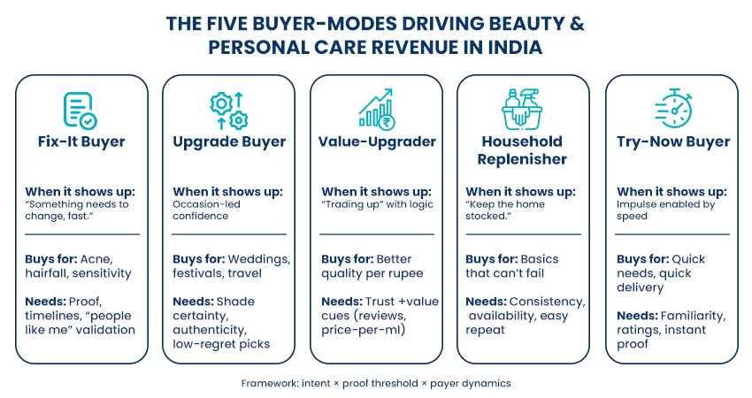 1) The Fix-It buyer: This buyer has specific problems like acne, pigmentation, hair fall, dandruff, odour, or sensitivity. They are not shopping for fun—they want to solve a problem and lower risk. The decision often involves several people: the user wants relief, influencers provide proof (like creator videos, reviews, or advice from clinicians), and the payer could be the buyer or a family member, especially for teens. Here, ingredient transparency and digital discovery are most important because trust comes from clear evidence.