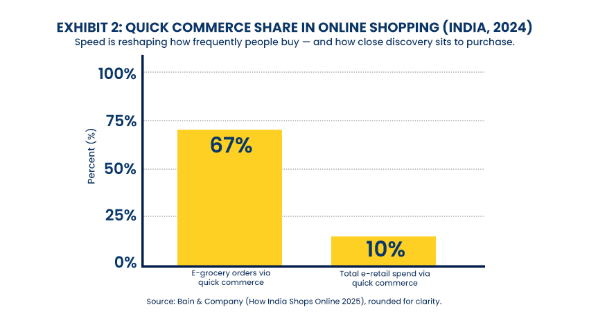 Bain’s 2025 report on India’s online shopping notes that in 2024, more than two-thirds of all e-grocery orders and about one-tenth of total e-retail spend happened on quick commerce platforms, and it expects rapid growth to continue through 2030.