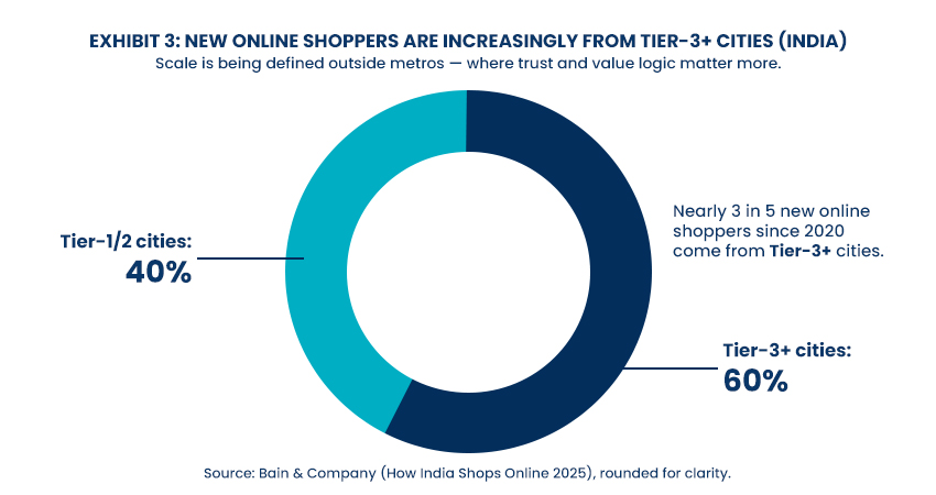 With almost 60% of new online shoppers since 2020 coming from Tier-3 and smaller cities, the way people buy changes. Decision-makers in the household are often more important, and people look for clear, community-based proof. Once a product is trusted by the community, it spreads quickly through peer networks, but trust is the key to getting started.