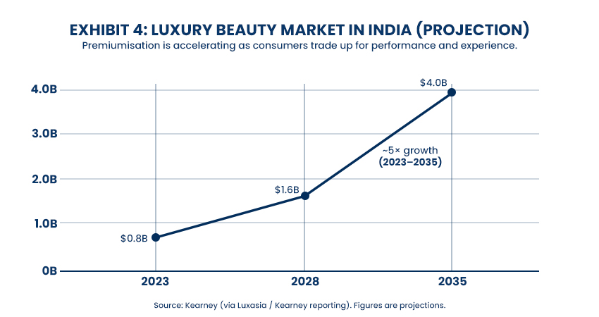 Kearney projects that India’s luxury beauty market could grow to $1.6B by 2028 and $4.0B by 2035.